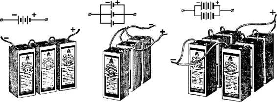 При последовательном соединении общее напряжение батареи равняется сумме напряжений отдельных элементов, входящих в состав батареи. При параллельном соединении элементов получается, в сущности, один элемент, емкость которого равна сумме емкостей всех параллельно соединенных между собой элементов.