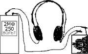 Из батарейки, телефонных трубок и испытываемого конденсатора составляется последовательная цепь. В момент замыкания этой цепи в телефоне будет слышен легкий щелчок. Цепь размыкается и через 2–5 сек. замыкается вновь. Если щелчок не повторится — это будет признаком исправности конденсатора. Повторение же щелчка указывает на то, что в конденсаторе имеется утечка.