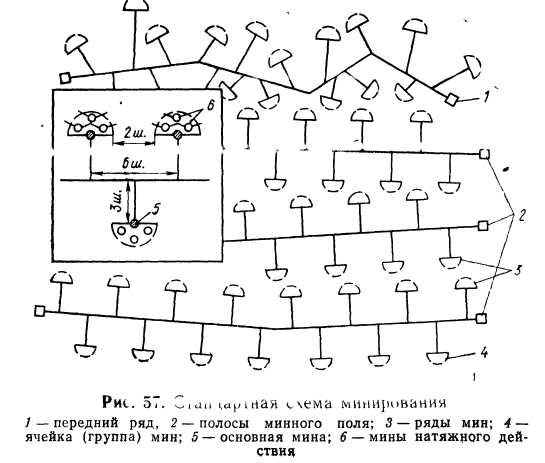 Минное поле, установленное по стандартной схеме (рис. 57), имеет не менее трех основных минных