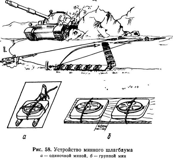 Управляемые мины приводятся в действие наблюдателем при появлении противника (цели). Для выборочного поражения цели в основном на дорогах и в узких проходах могут применяться буксируемые мины — минный шлагбаум (рис. 58).