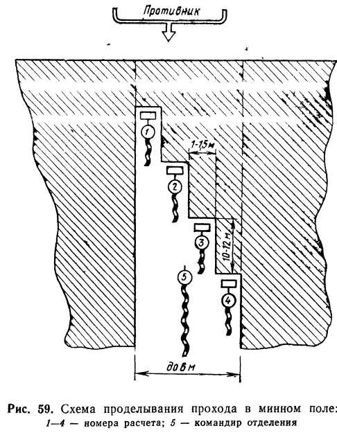 При проделывании прохода в минном поле втроем, вчетвером или отделением разведчики двигаются уступом вправо или влево (рис. 59) с расстоянием друг от друга не более 1,5 м по фронту (на ширину просмотра местности щупом или миноискателем) и 10–12 м в глубину. Каждый разведчик привязывает к поясу отрезок черно-белой ленты длиной 10–12 м, чтобы по нему мог ориентироваться сзади идущий. Командир отделения или разведчик, движущийся сред-