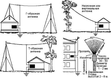 Антенны, предназначенные для приема на детекторный приемник, вообще ничем не отличаются от антенн для ламповых приемников, но так как громкость приема на детекторный приемник в большой степени зависит от качества антенны, то в этом случае антенну следует делать как можно лучше. В частности, высоту антенны нужно брать не меньше 8-10 м, длина горизонтальной части должна быть не меньше чем 15–25 м. Антенна должна быть хорошо изолирована от земли.