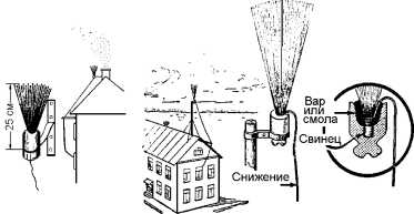 Основной частью безмачтовой антенны является пучок («кисть») из 40–50 кусков провода (длина каждого куска 20–25 см). В нижней своей части все куски провода, составляющие пучок, спаиваются и к ним присоединяется провод снижения. Весь торец зачищается и вставляется в фарфоровую банку, в дне которой для снижения просверлено отверстие. Свободное пространство в банке заполняется каким-либо водоупорным веществом. Банка при помощи кронштейна прикрепляется к карнизу стены, к дымовой трубе на крыше и т. п.