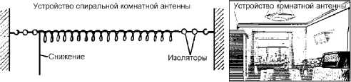 Комнатной антенной называется антенна (кусок провода), подвешенная внутри помещения. Формы таких комнатных антенн бывают чрезвычайно разнообразны. Простейшая антенна комнатного типа состоит из провода, подвешенного на изоляторах, от одного конца которого берется снижение к приемнику. Иногда под потолком комнаты провод протягивается в несколько лучей, зигзагообразно, в виде квадрата и т. д. Комнатные антенны, как правило, дают прием значительно более слабый, чем наружные антенны.