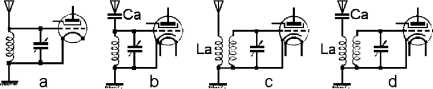 Наиболее простым способом присоединения антенны к приемнику является непосредственная связь с первым контуром приемника (а). Этот способ обеспечивает наибольшую громкость приема, но при таком присоединении антенны емкость ее оказывается приклоненной параллельно емкости контура, вследствие чего перекрытие первым контуром диапазона волн значительно уменьшается по сравнению с другими контурами приемника. Это чрезвычайно затрудняет соединение конденсаторов на одной оси и приводит к необходимости устраивать отдельный переключатель диапазонов для антенного контура. Кроме того, смена антенны или ее изменение будет сильно сказываться на перекрытии первого контура. Поэтому в приемниках всегда делается ослабленная связь с антенной, при которой указанные выше недостатки устраняются. Наиболее распространенным видом связи является емкостная (b). В этом случае антенна присоединяется к контуру приемника через небольшую емкость, обычно 10–20 см. Такой вид связи контура с антенной дает вполне удовлетворительные результаты в коротковолновой части радиовещательного диапазона. В длинноволновой же части наблюдается некоторое ослабление приема. Применяется также индуктивная связь с антенной (так называемая «ненастроенная антенна», с). Этот способ состоит в том, что в цепь антенны включается ненастраивающаяся катушка, обычно с большим числом витков, и первый контур приемника индуктивно связывается с этой катушкой. Этот способ присоединения антенны, как и предыдущий, имеет тот недостаток, что величина связи зависит от частоты, т. е. от настройки приемника. Следовательно, усиление приемника на различных волнах получится не одинаковым. Наилучшим способом связи антенны с приемником является так называемая индуктивно-емкостная связь (d). При такой схеме связи и при соответствующем подборе величин индуктивности La и емкости конденсатора Са удается получить сравнительно равномерную величину связи на всем диапазоне.