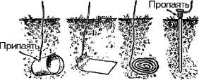К проводу заземления припаивается металлический лист размером примерно 30x40 см. Этот лист закапывается в землю на глубину 1,5–2 м. Можно также вместо припайки металлического листа провод свить в бухту (несколько колец) и затем второй конец провода подвести к приемнику, а самую бухту закопать в яму. Для заземления желательно применять провод того же диаметра, что и провод антенны или толще. Заземляющий провод вводится через отдельное отверстие в раме окна. К стене дома провод прикрепляется обыкновенными гвоздями. Яма для заземления выкапывается возле места ввода. Заземляющий провод можно также опустить в находящийся поблизости колодец, выгребную яму и т. д. Важно, чтобы заземление находилось по возможности ближе к месту радиоустановки и почва заземления была бы сырой.
