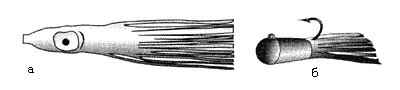 Существуют два принципиально отличных варианта: полуактивный и пассивный (рис. 24). Различаются они по игре, которая зависит от длины и наклона щупалец. Если короткие щупальцы “кальмара” идут строго назад, то они заиграют только при ступенчатой или волнистой проводке и только в вертикальной плоскости. Если же щупальца у основания расходятся в стороны, то даже при прямолинейном движении они начнут слегка колыхаться, “струиться”, что характерно для активных моделей. А если применить неравномерную проводку, то такие “осьминоги” будут то сжиматься, то расправляться — “задышат” и не оставят хищника равнодушным.
