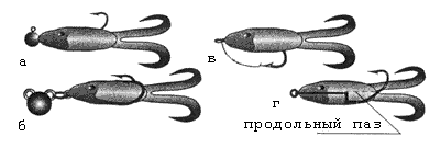 Приманка одевается как на обычную небольшую джиг-головку, так и на специальные более сложные оснастки (рис. 21). Так как резиновая “лягушка” заметно тяжелее, чем твистер или виброхвост, то ее можно забрасывать даже без груза, оснастив приманку незацепляющимся крючком или используя плавающую головку. Лучшая проводка — поверху, через траву, с рывками и остановками. Моя практика показала, что на “лягушку” клюет более крупная щука.
