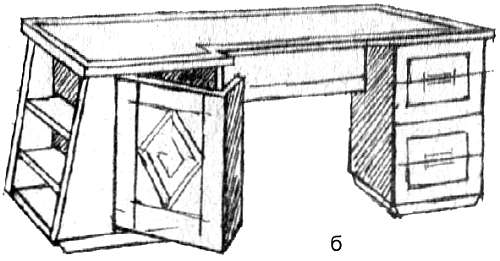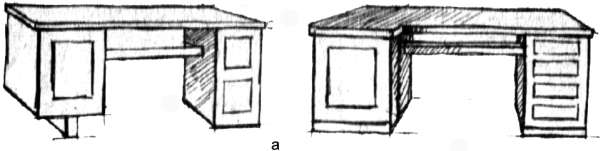 Перед началом создания собственно проектного чертежа обычно выполняют зарисовки аналогичных предметов для лучшего уяснения масштабности и размеров предмета, а затем – рисунки, выражающие идею вещи в общем виде. Первые рисунки, выполненные схематично, обогащают деталями, прорисовкой отдельных узлов общей структуры. Эти рисунки выполняют в аксонометрии или ортогональной проекции, показывающих стол с разных сторон. При этом проверяют форму крышки, ее отбортовку, примыкания крышки к тумбам, характер сторон, ящичных тумб. Как только характер стола в целом будет найден, выполняют его чертеж в масштабе 1:10, а также необходимые разрезы. Чертеж является черновым, рабочим, в него можно вносить поправки.
