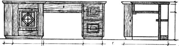 Подбирают фурнитуру и обозначают места ее расположения. Шаблоны изготовляют в натуральную величину в том случае, если детали имеют переменное сечение, криволинейные или ломаные, выполнены из массива древесины. Таким образом, комплект чертежей письменного стола будет состоять из эскиза в масштабе 1:10 с видами спереди и сбоку (если боковины тумб симметричны), виде сверху и трех разрезов – поперек через тумбы и середину стола и вдоль по крышке стола через обе тумбы; фрагмента тумбы в масштабе 1:2 – 1:4, показывающего четыре стороны тумбы (один вид изнутри из-под крышки), и двух разрезов через тумбу в том же масштабе; шаблонов, выполненных в натуральную величину.