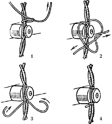 Для равномерной натяжки провода сначала надевают на средние промежуточные ролики, затем – на последующие. Провод к роликам привязывают хлопчатобумажной тесьмой, шнуром или тонким шпагатом в определенных точках линии: на ответвлениях, конечных и угловых роликах, на переходах с потолка на стену и с одной стены на другую, на выступах поверхности и у проходов. На промежуточные ролики провод лишь надевают, но не привязывают. Узлы размещают под проводом.