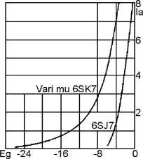 Лампы, обладающие переменной крутизной, имеют ту отличительную особенность, что характеристика их при малых смещениях вблизи нуля обладает большой крутизной и коэффициент усиления при этом возрастает до максимума. С увеличением отрицательного смещения, крутизна характеристики и коэффициент усиления лампы падают. Это свойство лампы с переменной крутизной позволяет применять ее в каскаде усиления высокой частоты приемника для автоматической регулировки силы приема: при слабых сигналах (смещение мало) лампа усиливает максимально, при сильных сигналах усиление падает. На рисунке слева приведена характеристика лампы с переменной крутизной 6SK7 и справа характеристика обычной лампы 6SJ7. Отличительная особенность лампы с переменной крутизной — длинный «хвост» в нижней части характеристики.