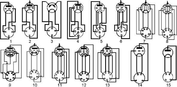1 — триод прямого накала; 2 — экранированная лампа прямого накала; 3 — двуханодный кенотрон; 4 — пентод прямого накала; 5 — триод косвенного накала; 6 — экранированная лампа с косвенным накалом; 7 — пентагрид прямого накала; 8 — пентагрид косвенного накала; 9 — двойной триод прямого накала; 10 — двойной диод-триод прямого накала; 11 — двойной диод-триод косвенного накала; 12 — пентод с косвенным накалом; 13 — двойной диод-пентод с косвенным накалом; 14 — мощный триод; 15 — мощный одноанодный кенотрон.