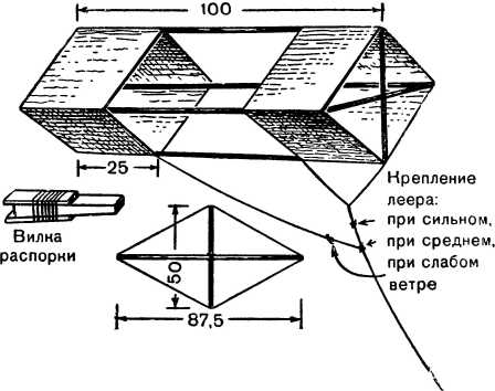 Леер нужно привязывать к «уздечке» в зависимости от силы ветра. Чем сильнее ветер, тем ближе к месту соединения двух бечевок его надо привязывать. В этом вы убедитесь на практике. Подробности конструкции коробчатого змея вы найдете на рисунке.