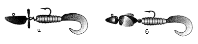 Для усиления шумовой и световой игры джиг-головка может снабжаться вращающимся элементом: пропеллером или турбинкой (рис. 39). На крючок, как и в большинстве остальных случаев, одевается резиновая насадка. Такая приманка кажется предпочтительнее, т. к. привлекает рыбу и звуком, и светом. К сожалению, это довольно редкие головки, которых у нас практически нет, поэтому детальная проверка высказанного предположения впереди.