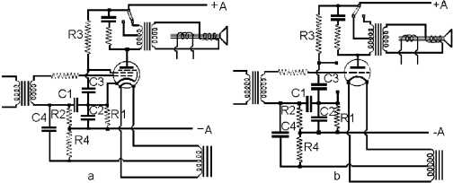 Выходные дроссели, включаемые в цепь оконечной трехэлектродной лампы, имеют обмотку, к началу которой через конденсатор присоединяется громкоговоритель.