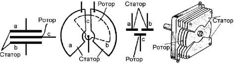 2) при помощи неподвижной катушки, сила тока в которой регулируется переменным конденсатором, при чем в этом случае применяются конденсаторы различных типов — обычные переменные и так называемые дифференциальные, состоящие из одной подвижной системы пластин и двух неподвижных систем.